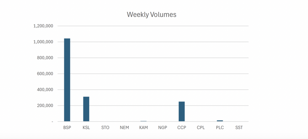 • BSP recorded large volumes, totaling over 64% of PNGX volumes this week. 1,042,654 BSP shares changed hands but closed 60t lower at K26.90.
