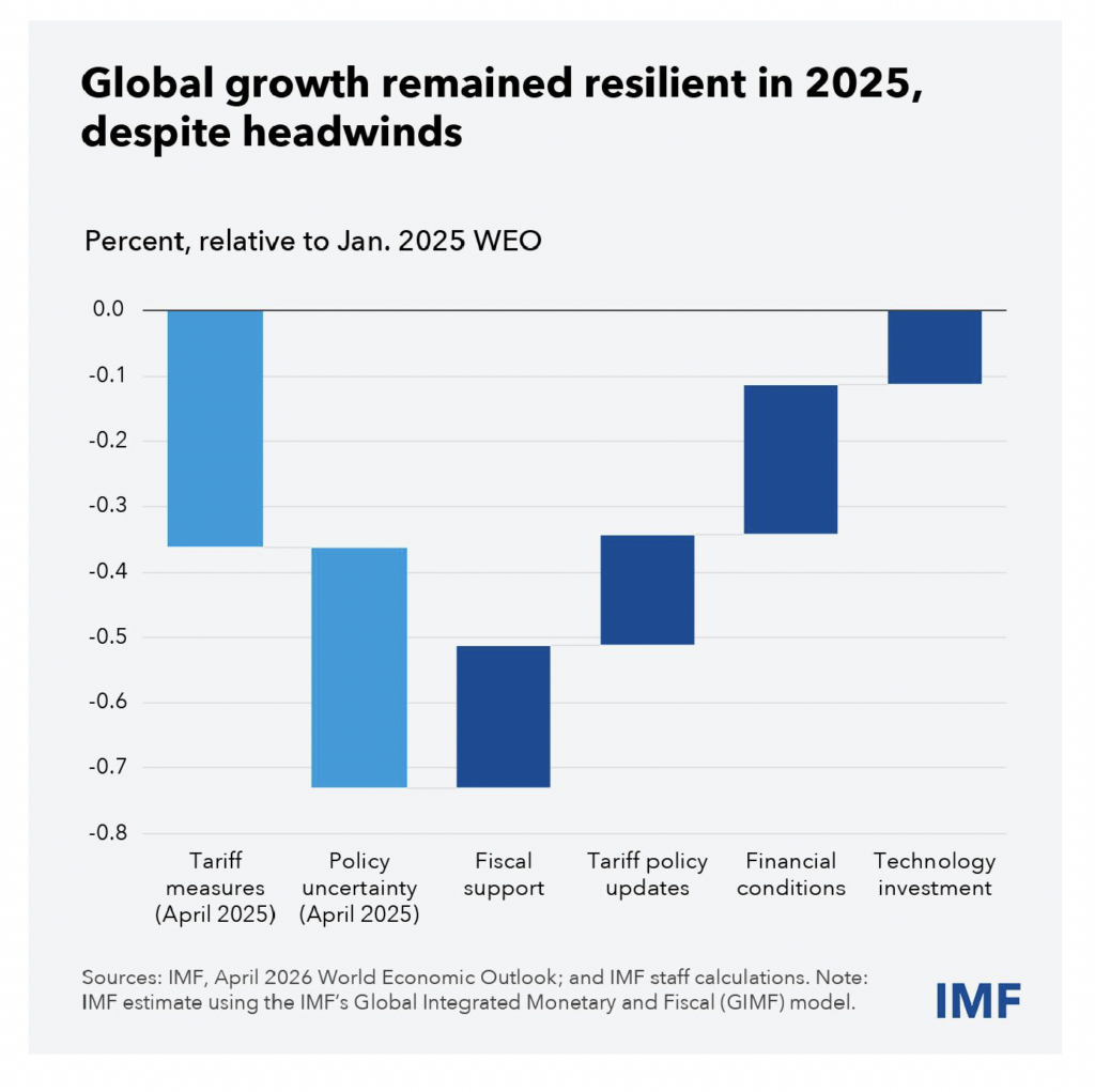 Despite major trade disruptions and policy uncertainty, last year ended on an upbeat note. The private sector adapted to a changing business environment, while powerful offsets came from lower US tariffs than originally announced, some fiscal support, and favorable financial conditions coupled with strong productivity gains and a tech boom. Despite some downside risks, the momentum was expected to carry over into 2026, lifting the pre-conflict global growth forecast to 3.4 percent.