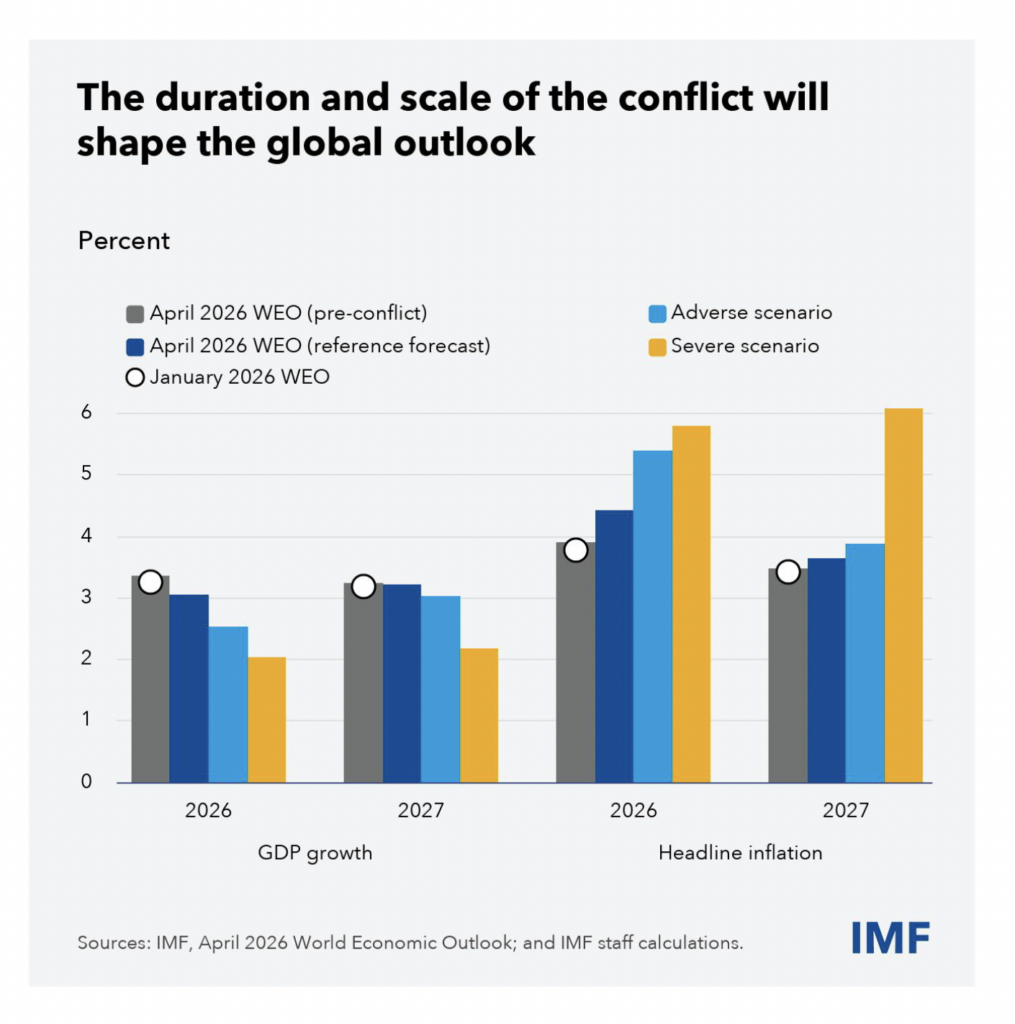Our reference forecast, which assumes a short-lived conflict and a moderate 19 percent increase in energy commodities prices in 2026, still puts global growth at only 3.1 percent this year and headline inflation at 4.4 percent, a sharp deviation from the global disinflation trend in recent years.
